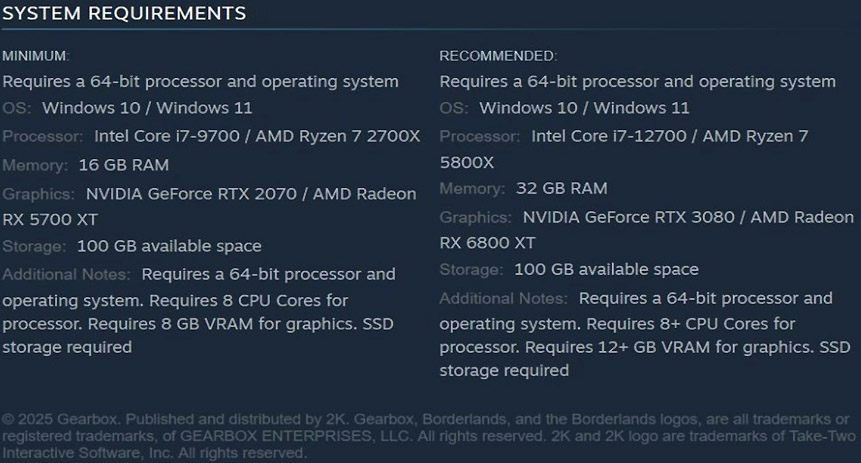 أعلن استوديو Gearbox عن مواصفات تشغيل لعبة Borderlands 4 على أجهزة الحاسب الشخصي، وذلك عبر صفحة اللعبة على منصة Steam.