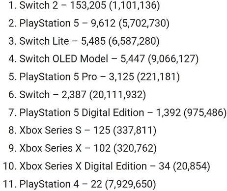 حقق جهاز نينتندو سويتش 2 مبيعات تجاوزت 153 ألف وحدة هذا الأسبوع، ليصل إجمالي مبيعاته إلى أكثر من 1.1 مليون وحدة منذ إطلاقه قبل أسبوعين فقط. ومع ذلك، بدأت المتاجر اليابانية تعاني بشكل ملحوظ من نفاد الشحنات بالكامل. أما جهاز السويتش الأول، ورغم ظهور خليفته، فما زال يحقق مبيعات جيدة بلغت أكثر من 13 ألف وحدة هذا الأسبوع، فيما كانت مبيعاته خلال نفس الفترة العام الماضي تتجاوز 38 ألف وحدة، مما يشير إلى انخفاض ملموس.