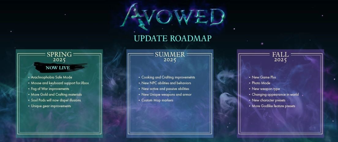 أعلن فريق التطوير Obsidian Entertainment عن جدول تحديثات لعبة Avowed لبقية العام الجاري، والذي يتضمن تحديث الربيع الذي تم طرحه بالفعل، يليه تحديث الصيف، ثم تحديث الخريف كآخر تحديثات العام.
